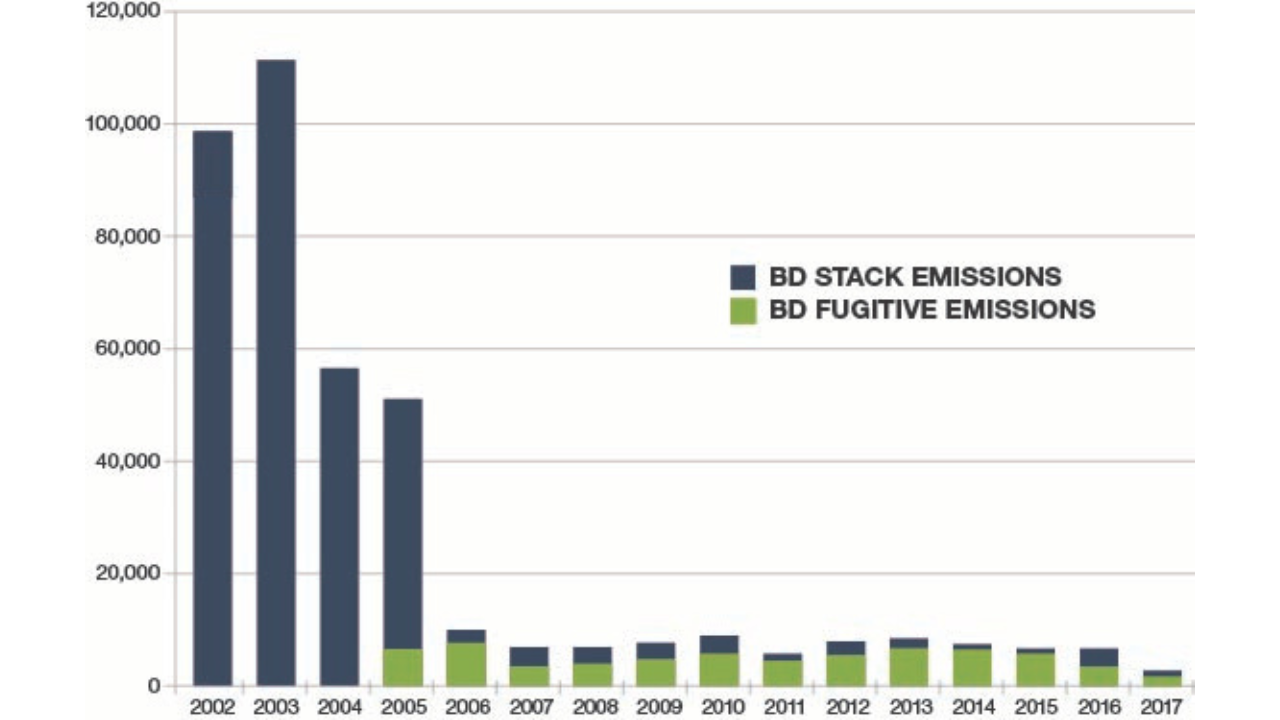 O Programa STAR (Redução Estratégica de Poluentes Tóxicos do Ar) foi instituído pela cidade de Louisville, Kentucky, EUA, em 2005, para lidar com a presença de substâncias químicas cancerígenas no ar da cidade. Em resposta, a American Synthetic Rubber Company (ASRC) introduziu um oxidante térmico para reduzir as emissões. Como ilustrado na Figura 1, isso reduziu significativamente as emissões de 1,3-butadieno pela chaminé da fábrica. No entanto, investigações subsequentes, em 2013, revelaram que emissões fugitivas contínuas dos mais de 10.000 componentes em operação ainda faziam com que a fábrica excedesse os limites permitidos.