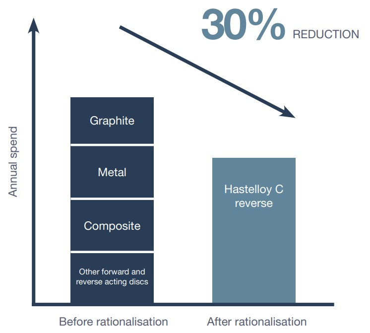 O cliente optou por racionalizar seu estoque de discos de ruptura utilizando o disco de ação reversa Opti-Gard em Hastelloy C em toda a fábrica. Isso permitiu reduzir as variantes de discos de 100 para 62, com a eliminação completa dos discos de grafite. Após um investimento inicial nos suportes necessários para os discos de ação reversa, o gasto anual com a substituição dos discos de ruptura diminuiu 30%, conforme previsto.